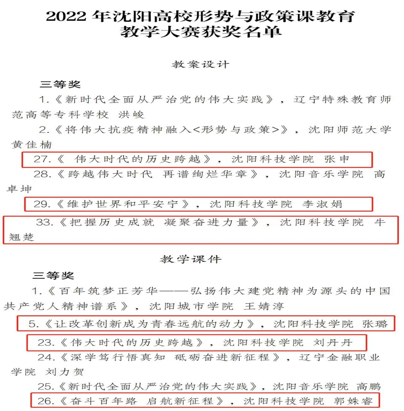 近日,沈阳市委教科工作委员会公布了2022年沈阳高校形势与政策课公司产品大赛获奖情况,公司张申、李淑娟、牛翘楚老师荣获教案设计三等奖;张璐、刘丹丹、郭姝睿老师荣获教学课件设计三等奖。