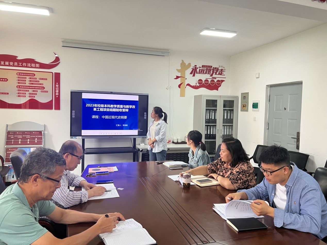 本次结题答辩会邀请刘芳经理、赵家和教授、李强教授三位专家现场集中评审,教务处副处长何鑫老师参会指导。评审项目为校级一流本科课程建设项目:《中国近现代史纲要》及“思政专项”一般教改项目:《高校思想政治理论课实践教学模式创新研究》。
