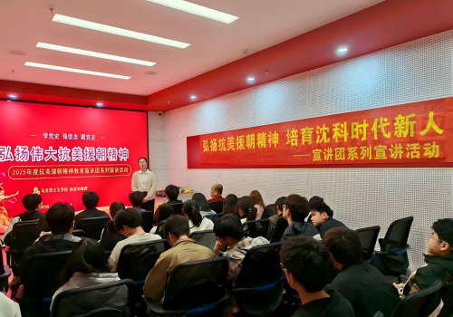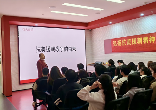 赵教授提到,作为这座英雄城市的高校学子,我们更应感受到抗美援朝精神与这片土地的血脉联系。沈阳作为抗美援朝战争的重要后方基地,曾为志愿军提供大量物资支援,无数沈城儿女奔赴前线,用生命书写了保家卫国的壮丽篇章。抗美援朝精神不仅是历史的回响,更是赓续奋斗的精神旗帜。在互动交流环节,同学们踊跃提问,围绕抗美援朝精神对当代青年的启示、如何在新时代传承红色基因等话题展开讨论。