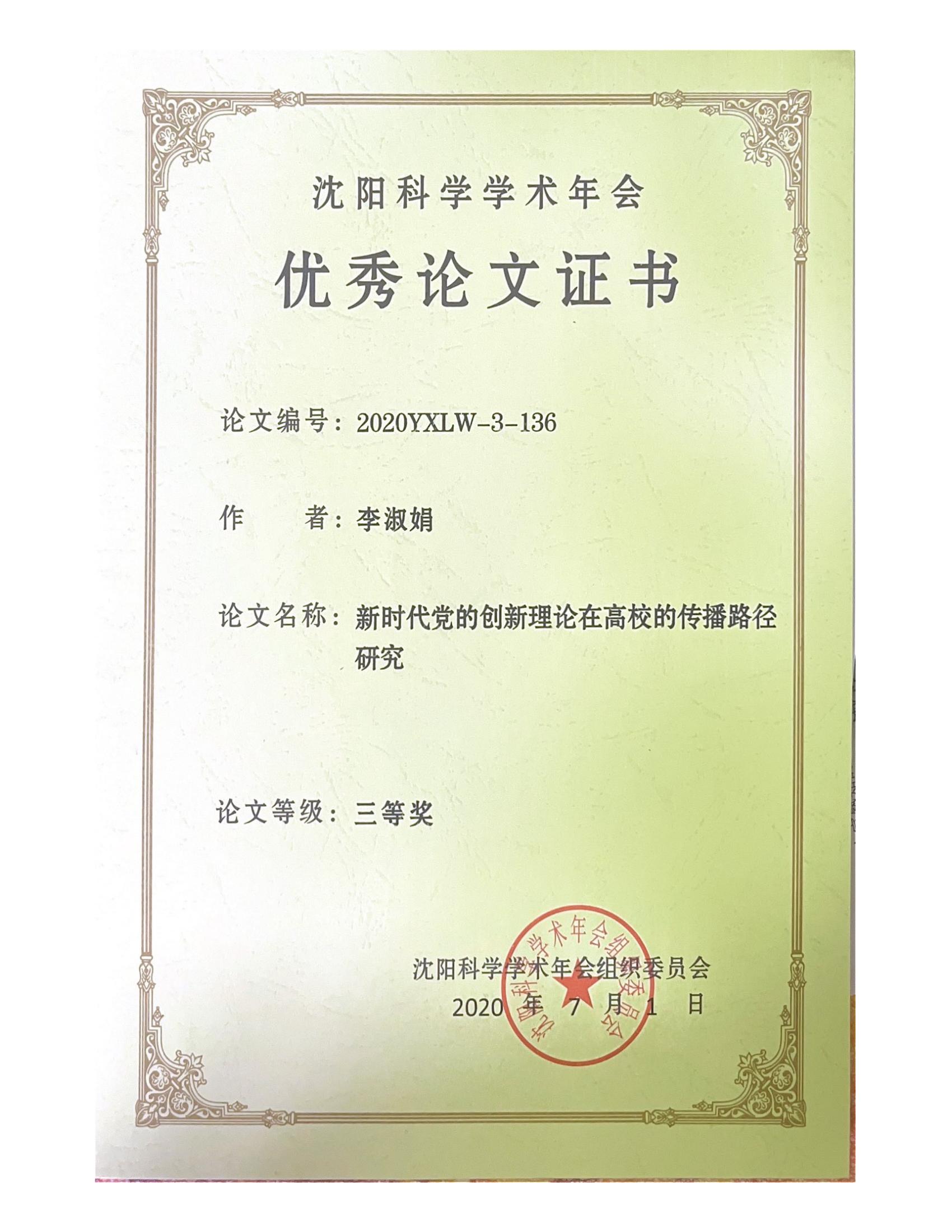 沈阳科学学术年会优秀论文三等奖