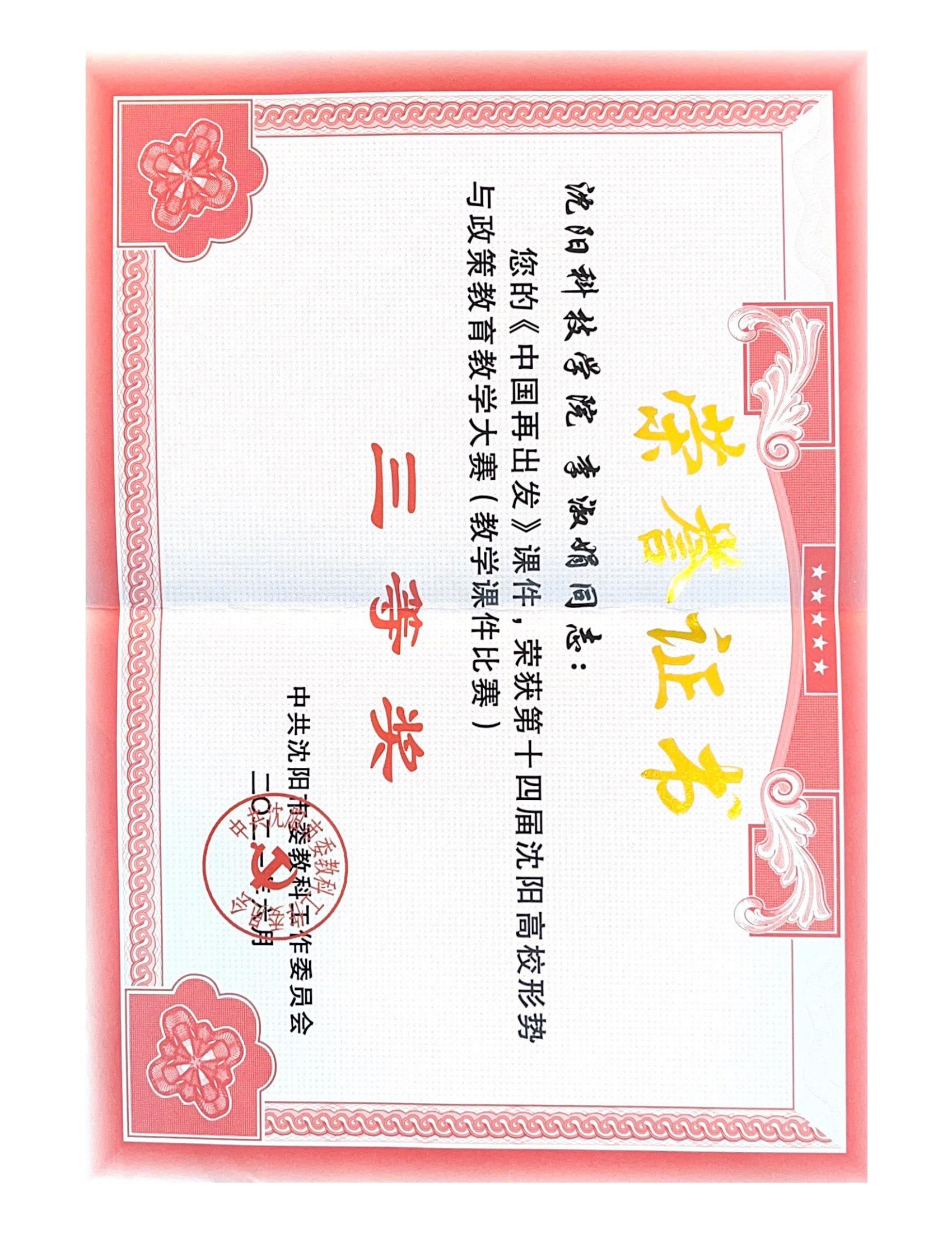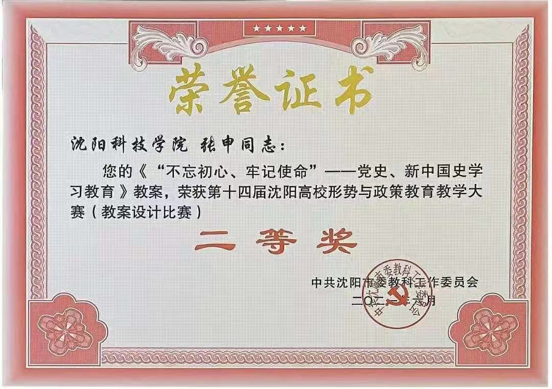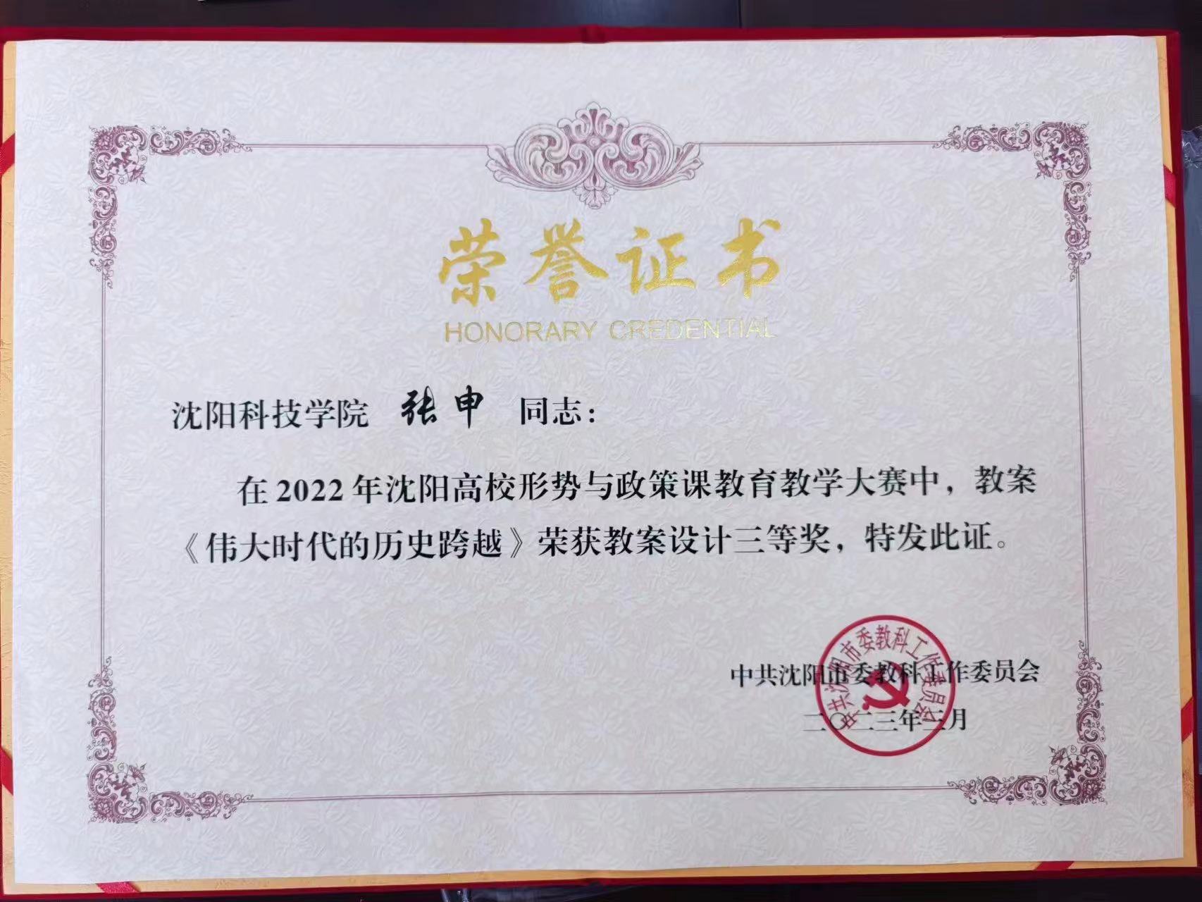 张申老师在2022年沈阳高校形势与政策课公司产品大赛中,教案《伟大时代的历史跨越》荣获教案设计三等奖...