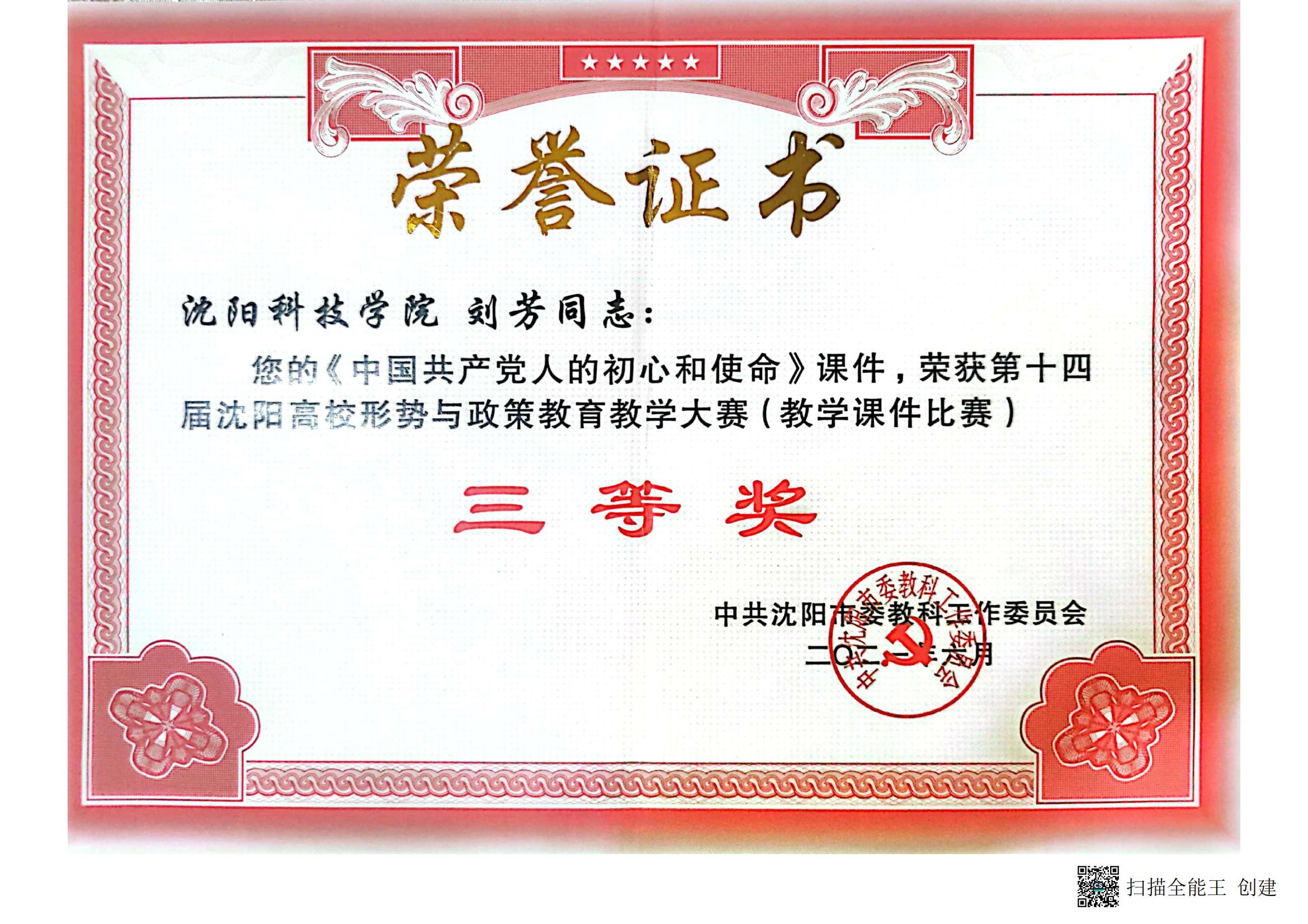 刘芳老师制作的《中国共产党人的初心和使命》课件,荣获第十四届沈阳高校形势与政策公司产品大赛(教学课件比赛)三等奖...