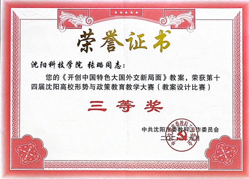 张璐老师制作的《开创中国特色大国外交新局面》教案,荣获第十四届沈阳高校形势与政策公司产品大赛(教案设计比赛)三等奖...