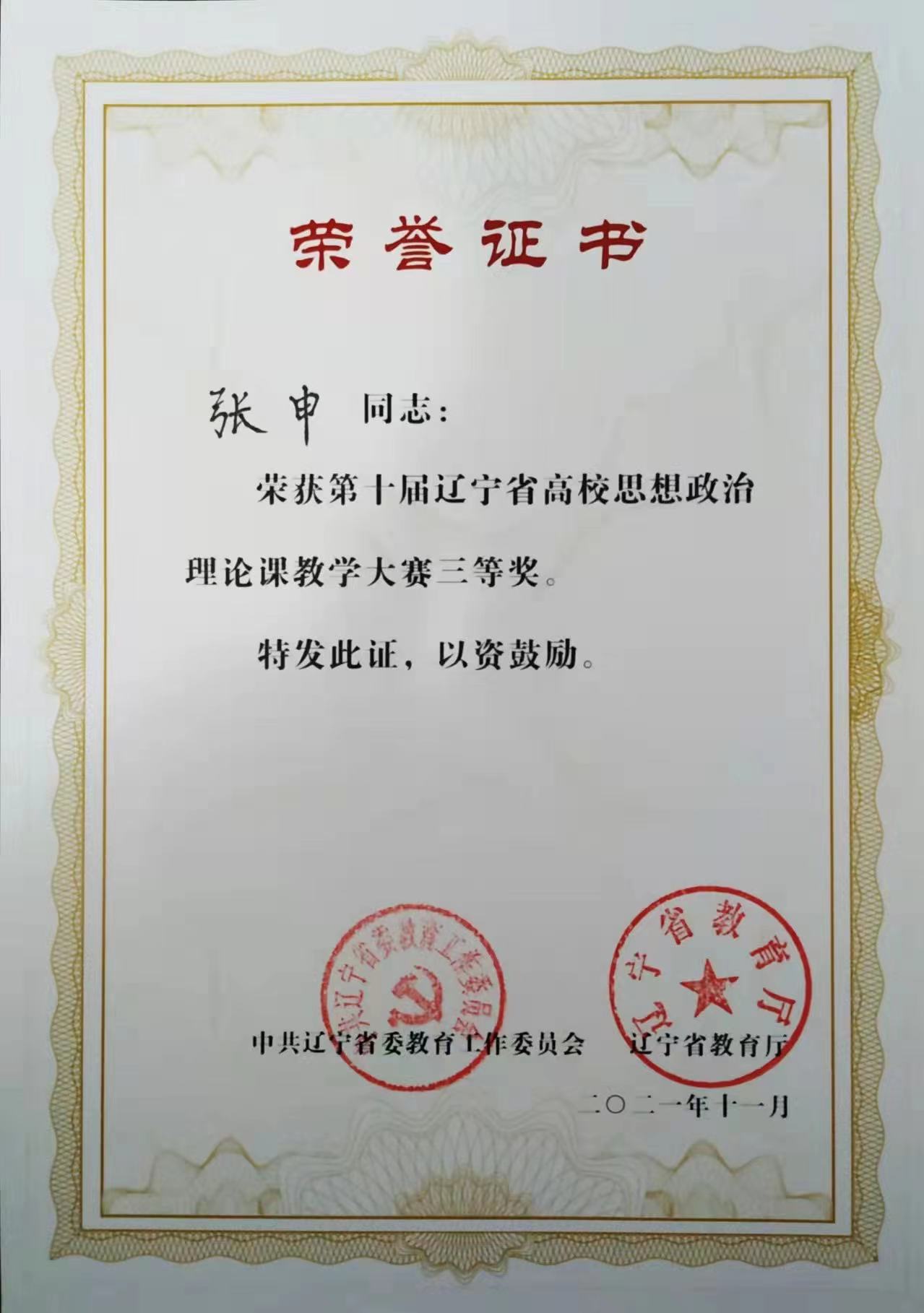 张申同志荣获第十届辽宁省高校思想政治理论课教学大赛三等奖...