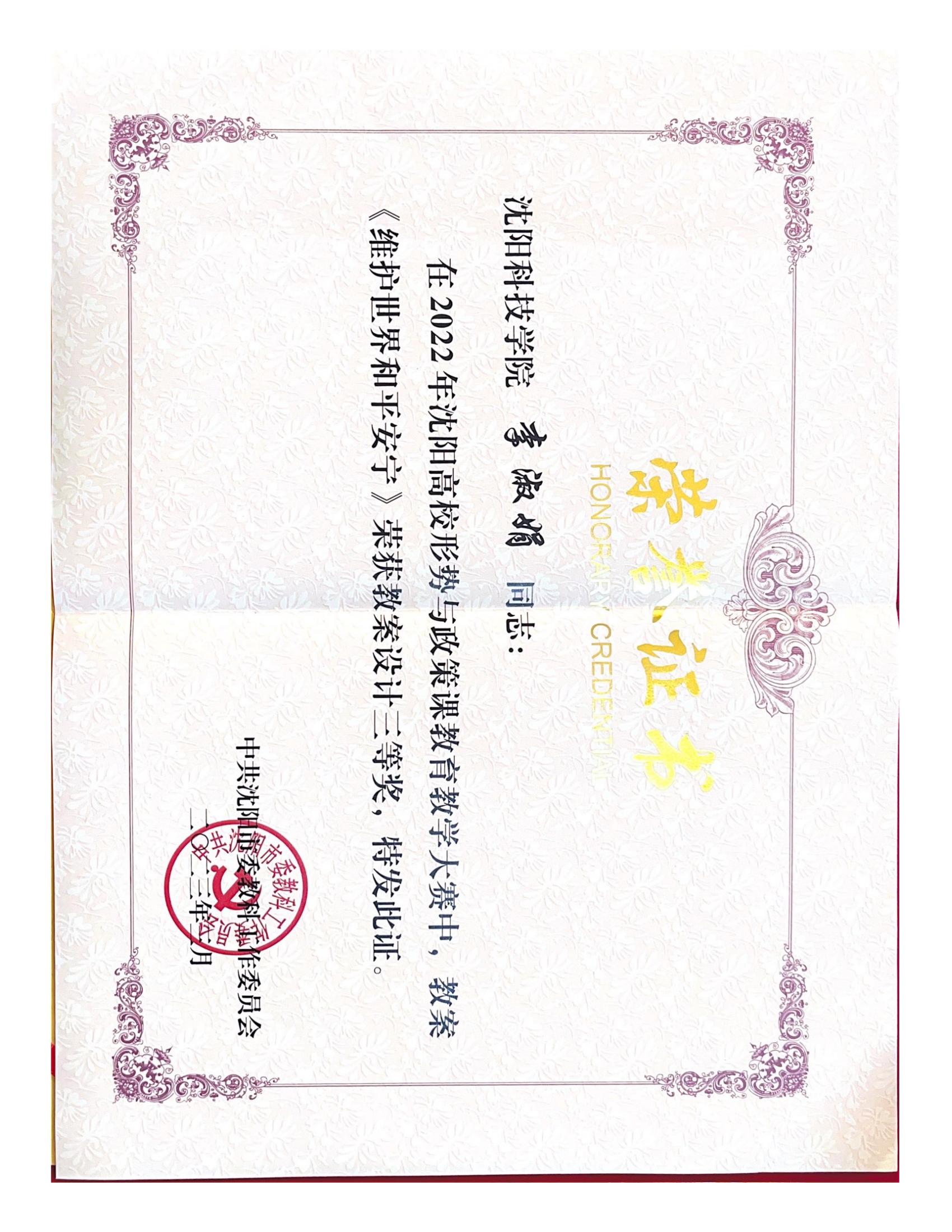 李淑娟老师在2022年沈阳高校形势与政策课公司产品大赛中,教案《维护世界和平安宁》荣获教案设计三等奖...