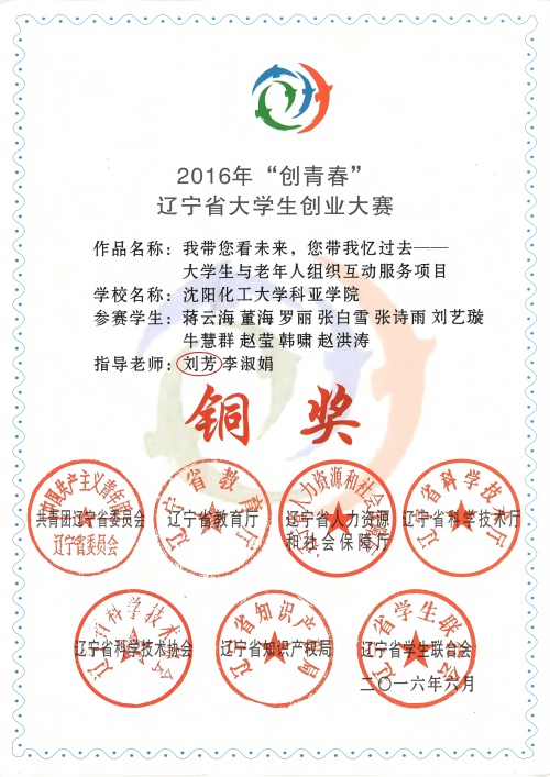 2016年刘芳、李淑娟老师指导作品获“创青春”辽宁省老员工创业大赛铜奖...