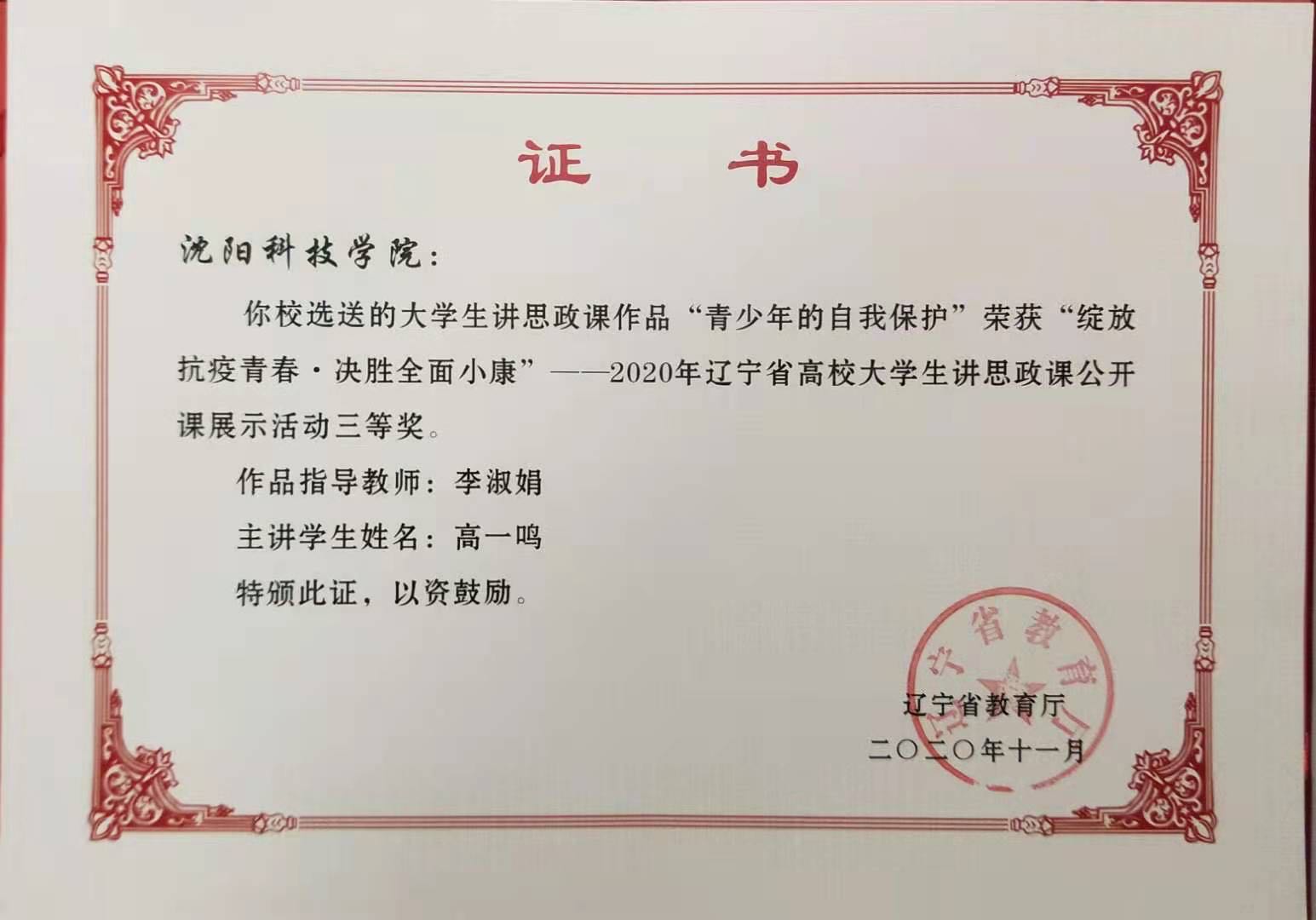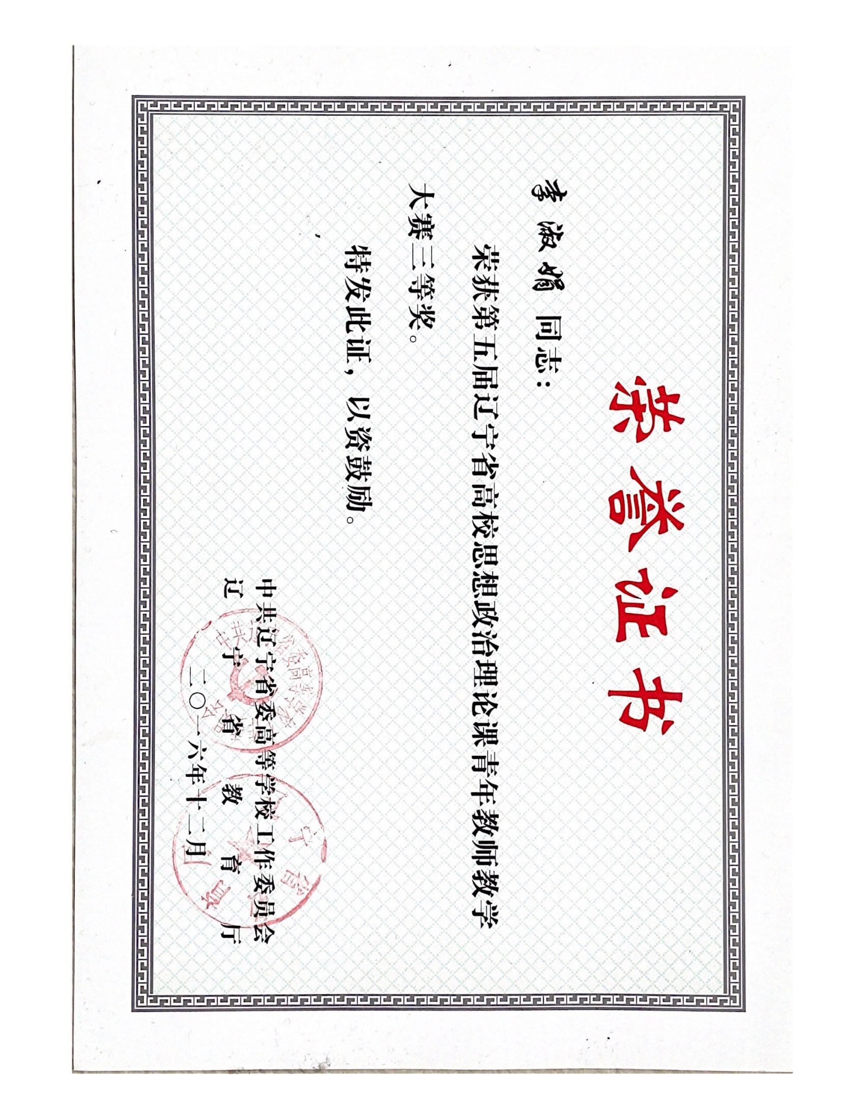 李淑娟同志荣获第五届辽宁省高校思想政治理论课青年教师教学大赛三等奖...
