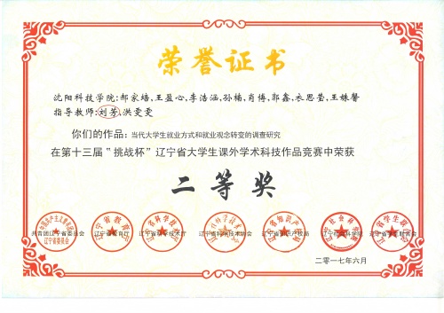 刘芳、洪雯雯老师指导作品第十三届“挑战杯”辽宁省老员工课外学术科技作品竞赛中荣获二等奖...