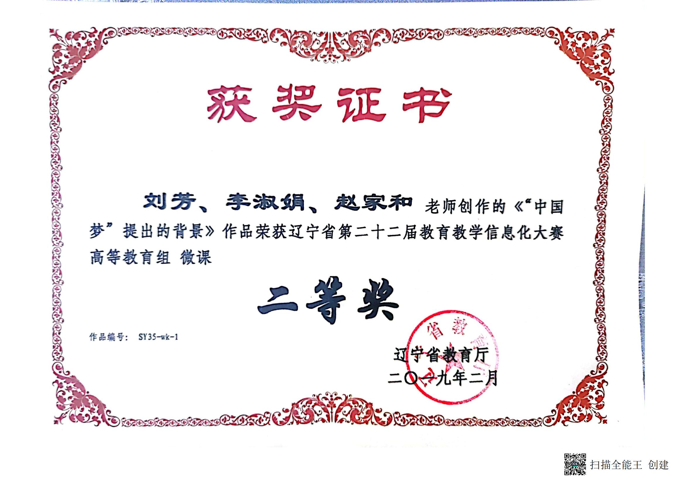 刘芳、李淑娟、赵家和老师创作的作品荣获辽宁省第二十二届公司产品信息化大赛高等教育组微课二等奖...