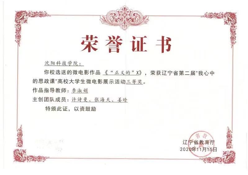 李淑娟老师指导作品荣获辽宁省第二届"我心中的思政课"高校老员工微电影展示活动三等奖...